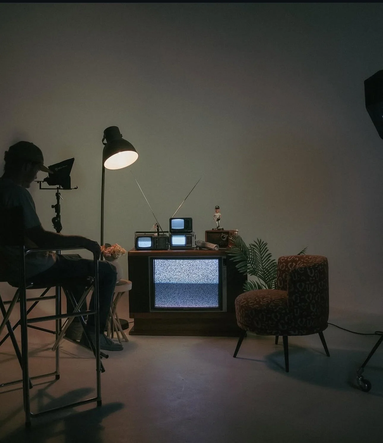 Make your space feel limitless by bending the rules of proportion. Use oversized props — like giant flowers, blown-up prints, or mountains of fabric — to make your subject feel small and cinematic. Or flip the concept: place mini props (toy TVs, tiny furniture, lyric pages) in the frame to exaggerate size and perspective. Against the cyc’s seamless backdrop, these contrasts feel otherworldly — like stepping into a dream sequence where reality is optional.